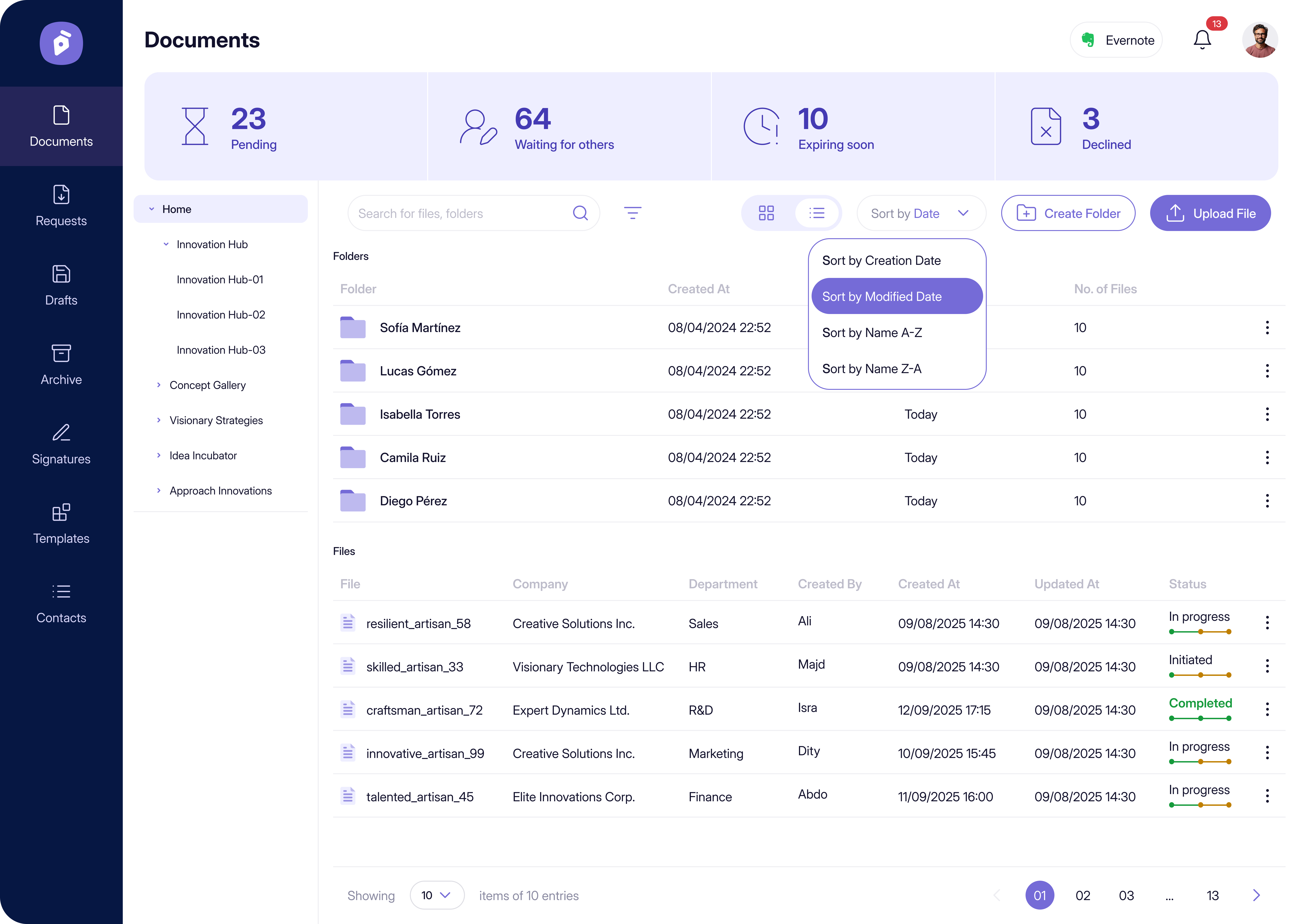 Automate signing routes with role-based permissions, approvals, and delegation.Every action is logged in a real-time audit trail to guarantee traceability and compliance.